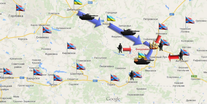 Сегодня утром возник оперативный кризис, бронегруппа 24-й отдельном механизированной бригады в ночь с 7 на 8 августа проскочила к Миусинску, а утром 9 августа оттесненные от Миусинска, ворвались в Красный Луч, откуда отступили часть неустойчивых подразделений ополчения. Одновременно с этим через Фащевку и Вахрушево со стороны Дебальцево последовал деблокирующий удар усиленной бронегруппой. В итоге, к обеду 9 августа с учетом выходящих из котла частей и деблокирующей группой противник имел до 30 танков и примерно столько же БМП/БТРов и до 700 человек пехоты.