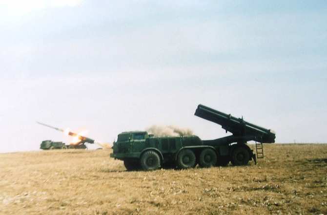 Справка. РСЗО 9К57 «Ураган» — советская реактивная система залпового огня калибра 220 мм. Боевая и транспортная машина базируются на доработанных шасси грузового автомобиля (ЗИЛ-135ЛМ). Дальность стрельбы от 8 до 35 км. Площадь поражения 426 тысяч кв. м. В 2012 году на вооружении украинской армии находились137 систем «Ураган».